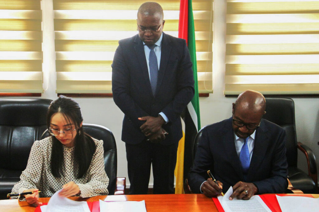 O Ministro dos Transportes e Comunicações, Mateus Magala, e a Vice-presidente da Sociedade Terminal de Minérios de Chongoene, Qijia Xue, assinaram a Escritura Pública do Contrato de Concessão do Terminal Portuário de Chongoene, na província de Gaza. Aprovada recentemente pelo Conselho de Ministros, a concessão do Terminal Portuário de Chongoene estará sob a gestão daquela sociedade que é constitída pelas empresas Densheng Port SA. (com 80% do capital), e pela empresa Portos e Caminhos de Ferro de Moçambique (CFM), (com 20%). Esta sociedade, com uma vigência de 15 anos, tem em vista a construção, operação e gestão das infraestruturas portuárias para o armazenamento e manuseamento de areias pesadas a granel, provenientes da Mina de Areias Pesadas de Chibuto. Com capacidade para manusear cerca de 8 milhões de toneladas por ano, as obras do Terminal Portuário de Chongoene estão avaliadas em cerca de 55 milhões de Dólares, na sua fase-1, e será gerido e operado pelo CFM. A concessão prevê, ainda, projectos sociais como a construção da linha férrea Chibuto-Chókwe, com aproximadamente 73 quilómetros (Km), manutenção da estrada Chibuto-Chongoene, construção da estrada que liga a Estrada Nacional Nr.1 (EN1) em Chongoene até ao terminal, numa extensão de cerca de 7 Km, fornecimento de água e energia às populações circunvizinhas do local, entre outras iniciatiīvas. Falando momentos depois da assinatura da escritura pública, o Ministro Magala explicou que a construção do Terminal de Chongoene tem como objectivo viabilizar diversos projectos de desenvolvimento de Gaza, sendo o das areias pesadas de Chibuto apenas uma âncora, havendo expectativa de servir outras iniciativas locais para o crescimento deste ponto do país. Destacou igualmente os benefícios sociais e económicos da implementação do projecto, considerando as implicações negativas que o transporte dos produtos extraídos das areias pesadas de Chibuto, via rodoviária para o Porto de Maputo, como a degradação das estradas, poluição, sinistralidade rodoviária, entre outros males.